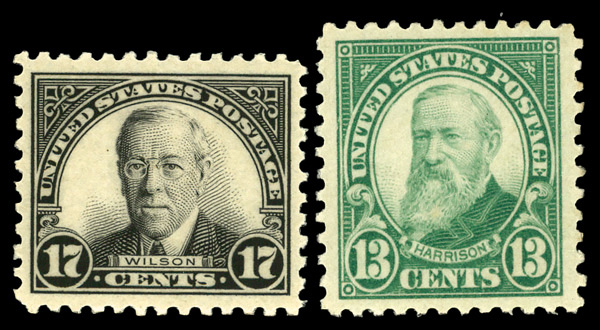 7101 nh 622-623 image1925-26, 13¢ Harrison and 17¢ Wilson (Scott 622-623), o.g., never hinged, Very Fine 13¢ is Extremely Fine.