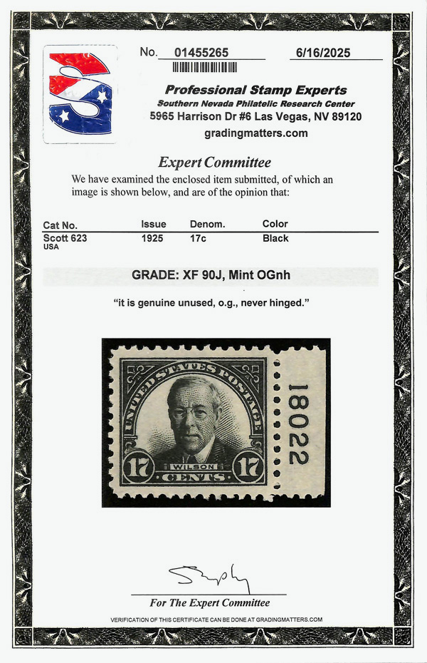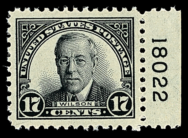 7104 nh 623 image1925, 17¢ Wilson (Scott 623), right margin plate number 18022 single, o.g., never hinged, a lovely jumbo positional, sound with clean impression and solid color, Extremely Fine, with 2025 P.S.E. certificate graded XF 90 J.