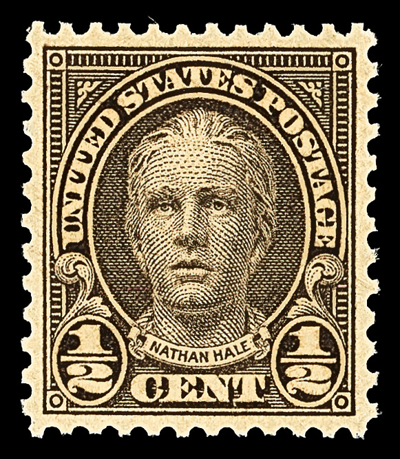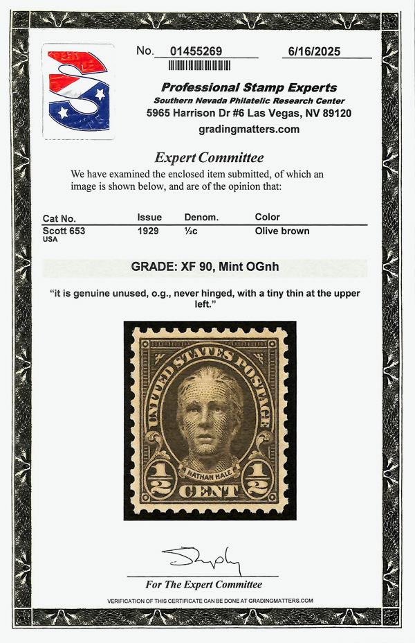 7108 nh 653 image1929, ½¢ Nathan Hale, rotary press printing (Scott 653), o.g., never hinged, face-fresh with crisp impression and superior centering; tiny thin at upper left, Extremely Fine, with 2025 P.S.E. certificate graded XF 90.
