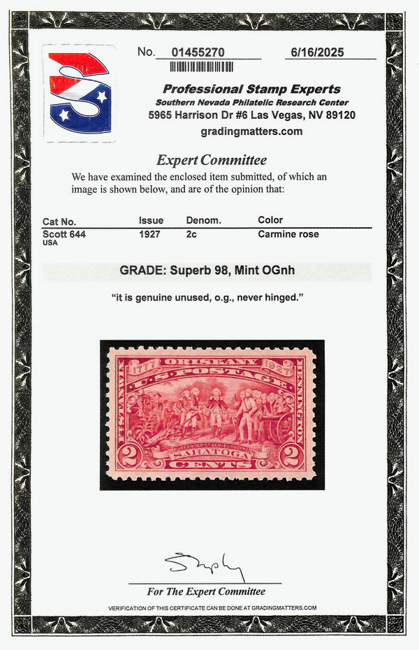 7107 nh 644 image1927, 2¢ Burgoyne (Scott 644), o.g., never hinged, a gorgeous stamp with captivating, brilliant color, clear impression, and exceptional centering, Superb, with 2025 P.S.E. certificate graded SUP 98.