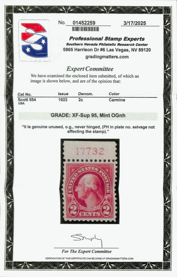 7088 nh 554 image1923, 2¢ Washington (Scott 554), plate number single, o.g., never hinged, Extremely Fine to Superb, with 2025 P.S.E. certificate graded XF-SUP 95.