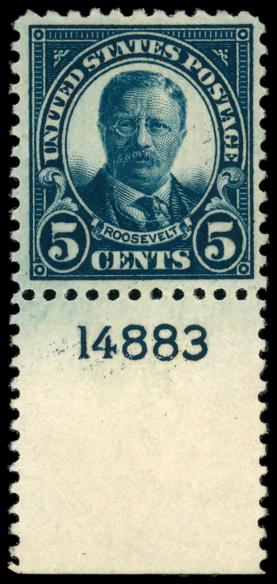 7089 nh 557 image1922, 5¢ Roosevelt (Scott 557), plate number single, o.g., never hinged, Fine to Very Fine. (Image) Suggested Bid $30