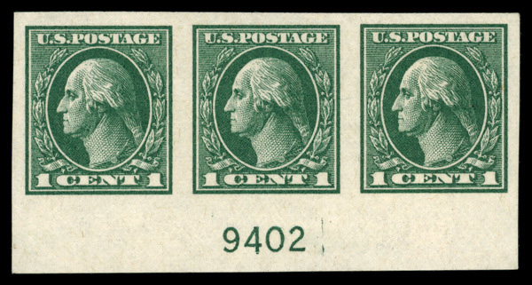 7083 nh 531 image1919, 1¢ green, offset printing, imperf. (Scott 531), strip of 3 with plate number, o.g., never hinged (gum skips), Extremely Fine.