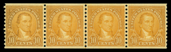7099 nh 603 image1924, 10¢ Monroe, rotary press coil, perf. 10 vertically (Scott 603), joint line strip of 4, o.g., never hinged, Very Fine.