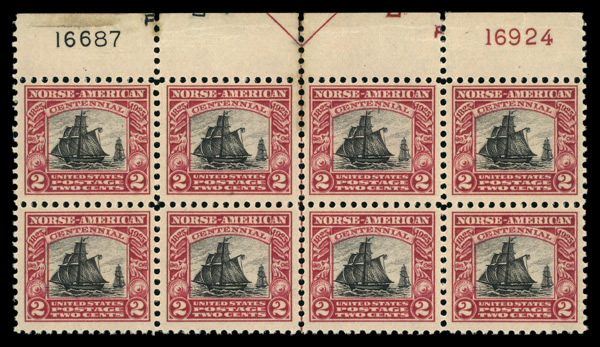 7100 ogbl 620 image1925, 2¢ Norse-American (Scott 620), plate block of 8 (perf separations), o.g., lightly hinged, Very Fine.