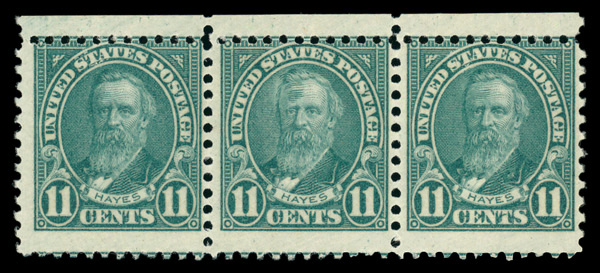 7112 nh 692 image1931, 11¢ Hayes, rotary press printing, retouched forehead (Scott 692), strip of 3, variety on center stamp, o.g., never hinged, Very Good.