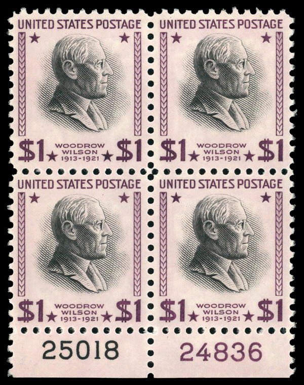 7119 nhbl 832c image1954, Presidential Issue, $1 Wilson, red violet & black, dry printing (Scott 832c), plate block of 4, o.g., never hinged, Extremely Fine.