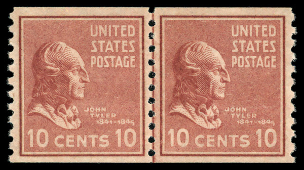 7120 nh 847 image1939, Presidential Issue, 10¢ Tyler, horizontal coil, perf. 10 vertically (Scott 847), joint line pair, o.g., never hinged, Extremely Fine.