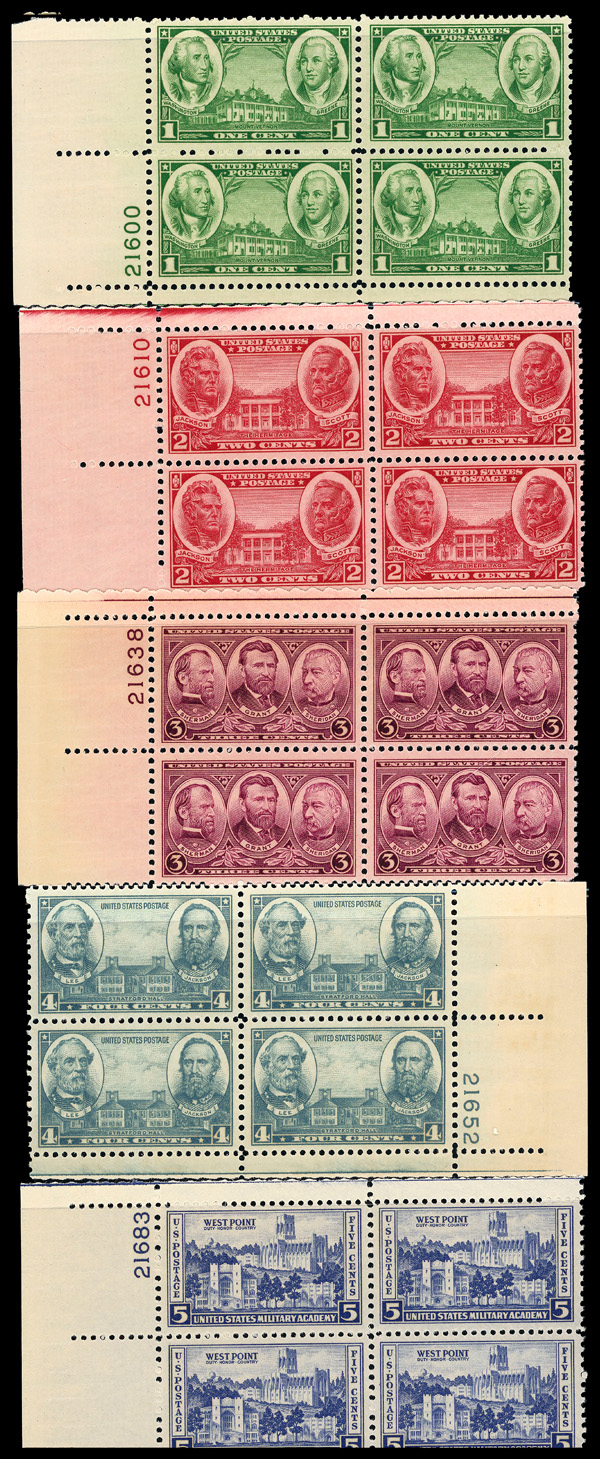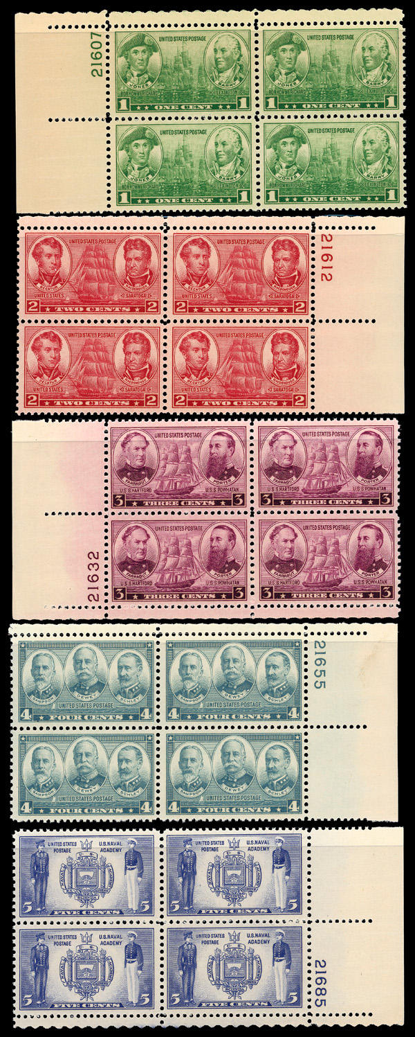 7118 nhbl 785-794 image1936-37, Army-Navy complete (Scott 785-794), set of 10, plate blocks of 4, o.g., never hinged, Very Fine to Extremely Fine.