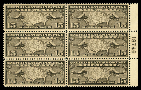 7207 nhbl C8 imageAirmail, 1926, 15¢ Map & Planes (Scott C8), plate block of 6, o.g., never hinged, Very Fine.