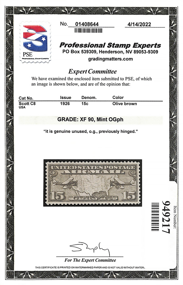 7206 og C8 imageAirmail, 1926, 15¢ Map & Planes (Scott C8), o.g., lightly hinged (gum skips), Extremely Fine, with 2022 P.S.E. certificate graded XF 90.