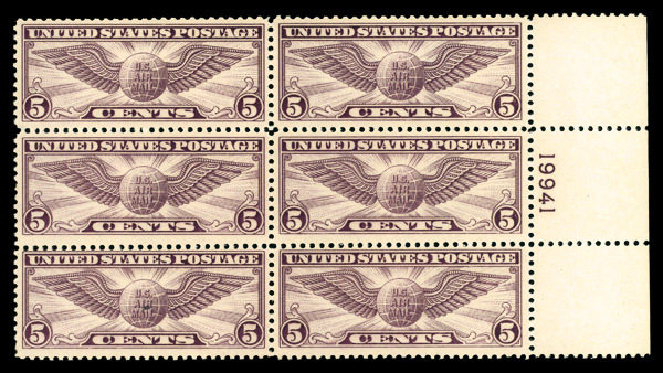 7211 ogbl C12 imageAirmail, 1930, 5¢ Winged Globe, flat plate printing (Scott C12), plate block of 6, o.g., lightly hinged, Very Fine.