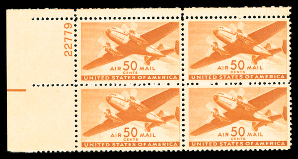 7216 nhbl C31 imageAirmail, 1941, 50¢ Transport (Scott C31), plate block of 4, o.g., never hinged, Very Fine to Extremely Fine.