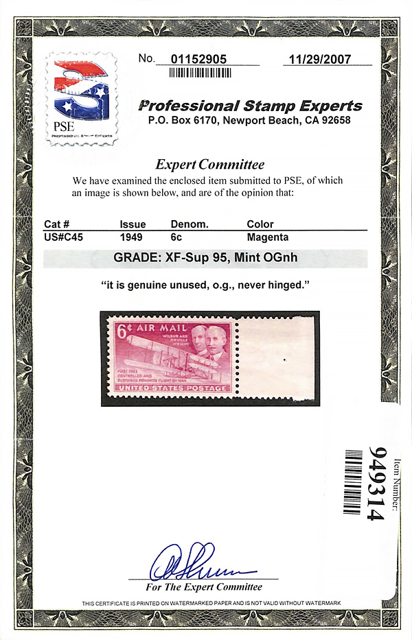 7219 nh C45 imageAirmail, 1949, 6¢ Wright Brothers (Scott C45), o.g., never hinged, Extremely Fine to Superb, with 2007 P.S.E. certificate graded XF-SUP 95.