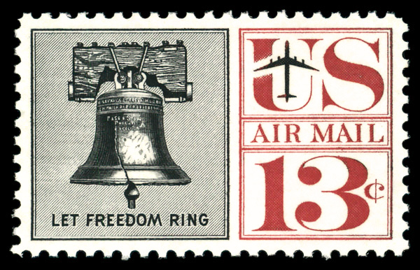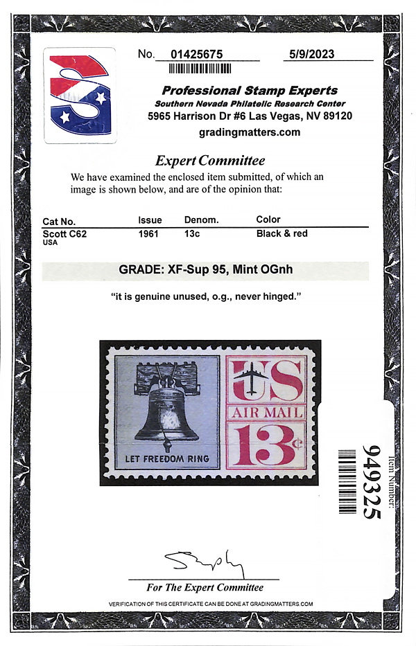 7220 nh C62 imageAirmail, 1961, 13¢ Liberty Bell (Scott C62), o.g., never hinged, Extremely Fine to Superb, with 2023 P.S.E. certificate graded XF-SUP 95.