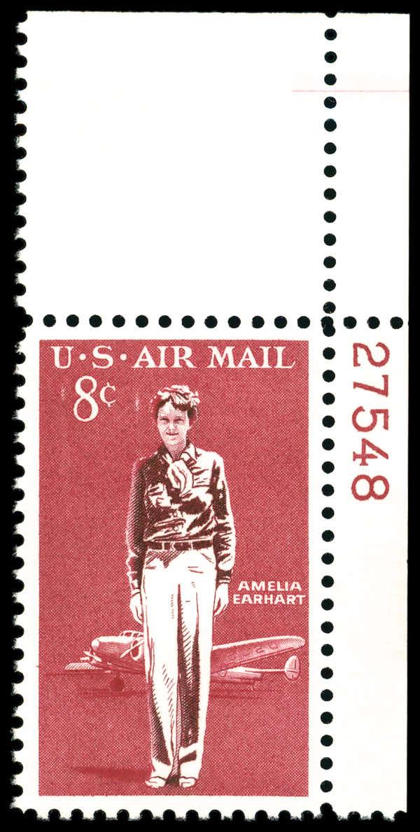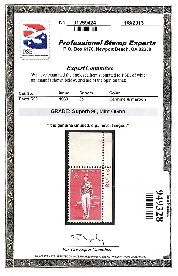 7223 nh C68 imageAirmail, 1963, 8¢ Amelia Earhart (Scott C68), plate number single, o.g., never hinged, Superb, with 2013 P.S.E. certificate graded SUP 98.