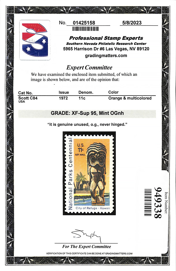 7225 nh C84 imageAirmail, 1972, 11¢ City of Refuge (Scott C84), o.g., never hinged, Extremely Fine to Superb, with 2023 P.S.E. certificate graded XF-SUP 95.