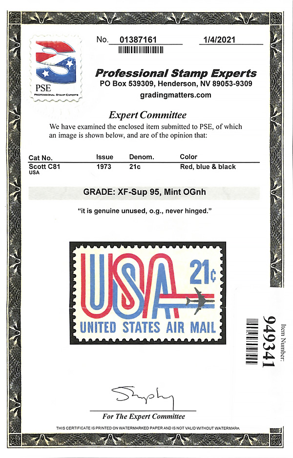 7224 nh C81 imageAirmail, 1973, 21¢ USA & Jet (Scott C81), o.g., never hinged, Extremely Fine to Superb, with 2021 P.S.E. certificate graded XF-SUP 95.