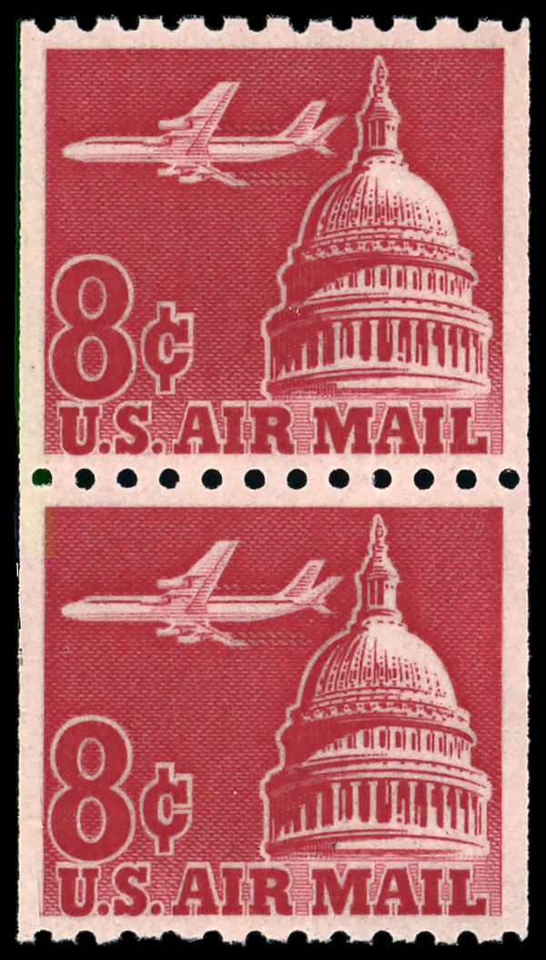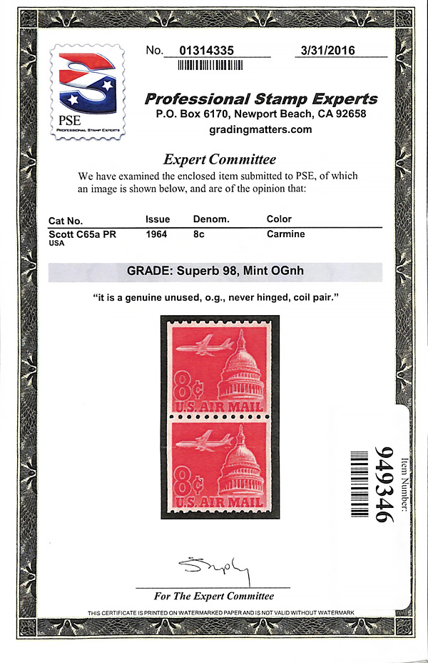 7221 nh C65a imageAirmail, 1962, 8¢ Jet & Capitol coil, tagged (Scott C65a), pair, o.g., never hinged, Superb, with 2016 P.S.E. certificate graded SUP 98.