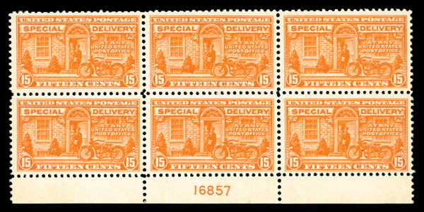 7233 ogbl E13 imageSpecial Delivery, 1925, 15¢ deep orange (Scott E13), plate block of 6, o.g., lightly hinged, Very Fine.
