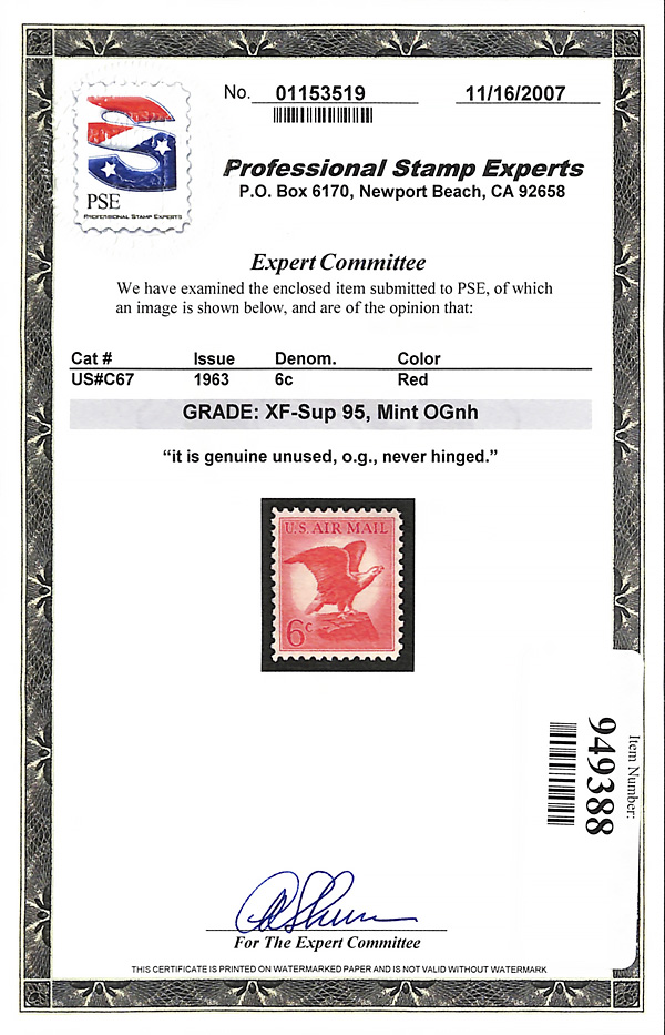 7222 nh C67 imageAirmail, 1963, 6¢ Eagle (Scott C67), o.g., never hinged, Extremely Fine to Superb, with 2007 P.S.E. certificate graded XF-SUP 95.