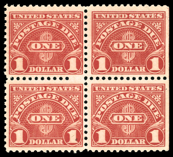 7235 nhbl J77a imagePostage Due, 1930, $1 scarlet (Scott J77a), right margin block of 4 with natural straight edge, o.g., never hinged (minor gum skips); 1 stamp with small creases, Fine to Very Fine.