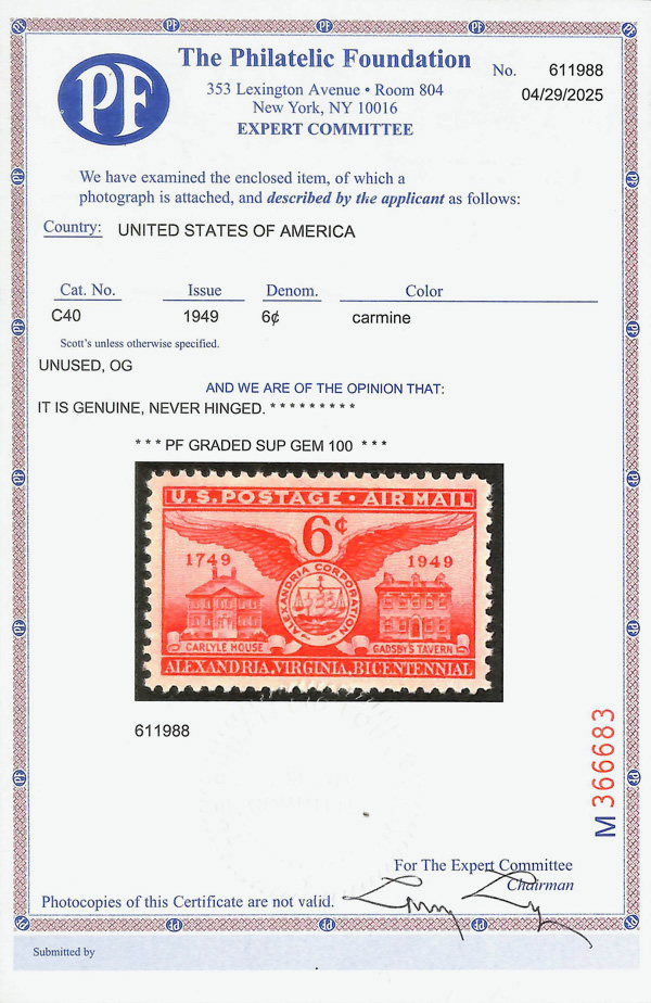 7218 nh C40 imageAirmail, 1949, 6¢ Alexandria Bicentennial (Scott C40), o.g., never hinged, Superb, with 2025 P.F. certificate graded GEM 100.