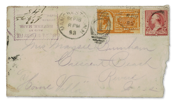 7228 cover E3 image1893, 10¢ orange (Scott E3), on Special Delivery Cover Manchester, NH to Revere, MA, postage paid by 2¢ Washington (#220) with Boston Transit mark and purple Revere, MA Special Delivery Fee handstamp. Rough opening at right, Fine.