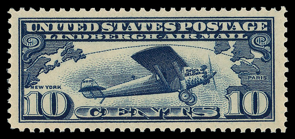 7209 nh C10 imageAirmail, 1927, 10¢ Lindbergh (Scott C10), o.g., never hinged, jumbo margins, Very Fine to Extremely Fine. (Image) Suggested Bid $20