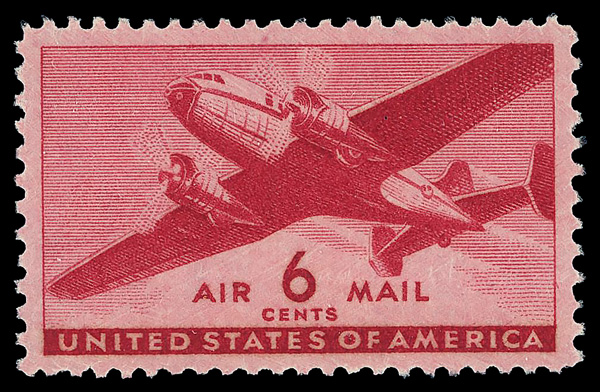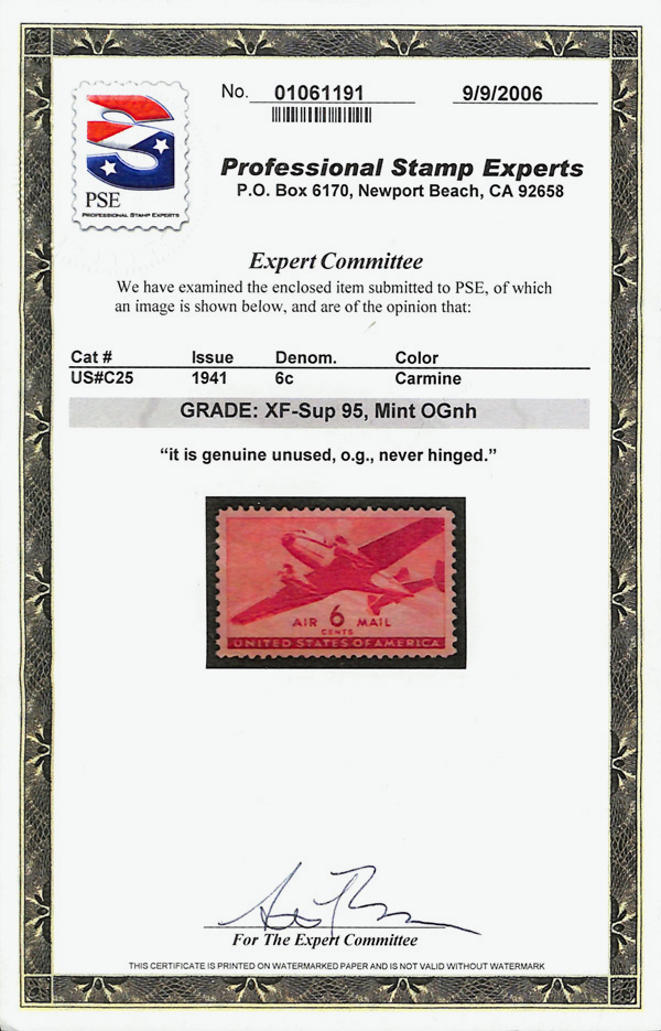 7215 nh C25 imageAirmail, 1941, 6¢ Transport (Scott C25), o.g., never hinged, Extremely Fine to Superb, with 2006 P.S.E. certificate graded XF-SUP 95.
