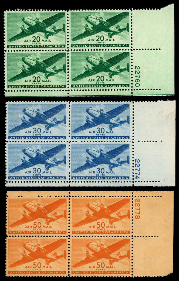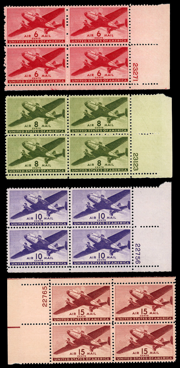 7214 nhbl C25-C31 imageAirmail, 1941-44, Transport complete (Scott C25-C31), set of 7, plate blocks of 4, o.g., never hinged, Very Fine to Extremely Fine.