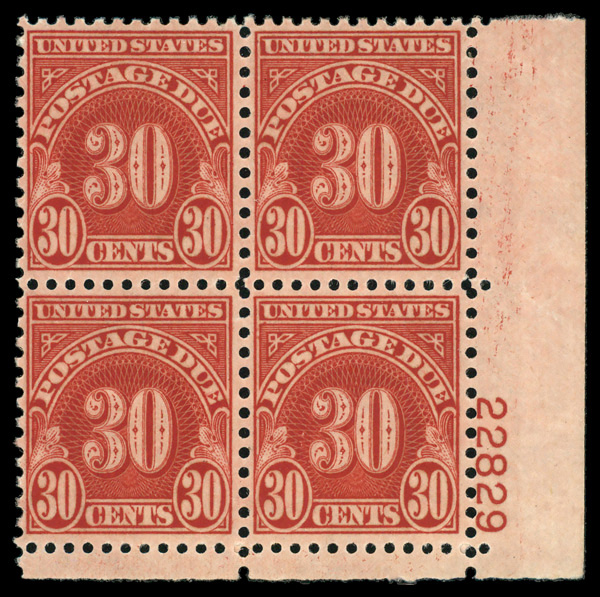 7237 nhbl J85a imagePostage Due, 1931, 30¢ scarlet (Scott J85a), plate block of 4, o.g., never hinged, Very Fine.