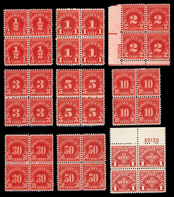 7236 nhbl J79a-J87a imagePostage Dues, 1931-56, ½¢ to $1 scarlet, complete, rotary press printing (Scott J79a-J87a), set of 9, blocks of 4 (2¢ PB & $1 with plate #), o.g., never hinged, Very Fine.
