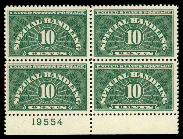 7240 nhbl QE1b imageSpecial Handling, 1955, 10¢ light green, dry printing (Scott QE1b), block of 4 with plate number, o.g., never hinged, Very Fine to Extremely Fine.