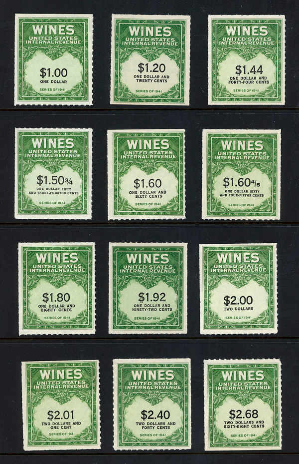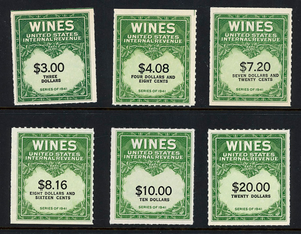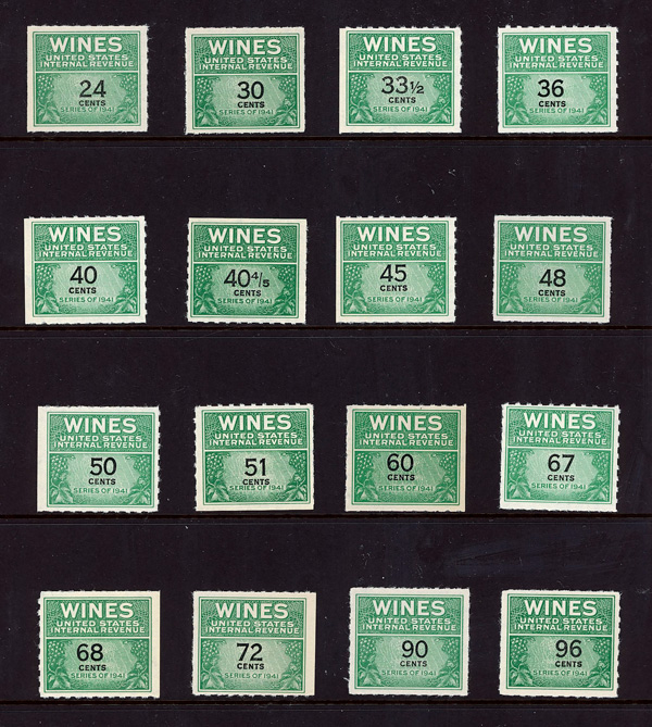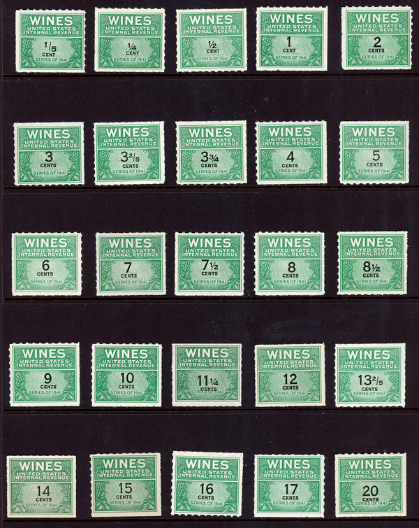 7268 ng RE108//RE203 imageWine Stamps, 1942-54, 1/5¢-$20.00 (Scott RE108//RE203), selection of 59 different, without gum as issued, Fine to Very Fine.