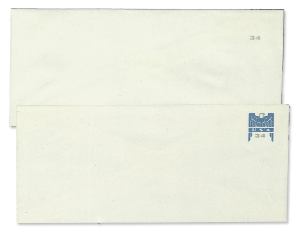 7261 og U646a imageEnvelope, 2001, 34¢ Eagle, blue gray omitted (Scott U646a), entire, with a normal example, o.g., never hinged, Extremely Fine.