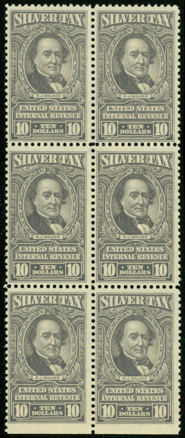 7272 nhbl RG125 imageSilver Tax, 1944, $10 gray (Scott RG125), bottom margin straight edge block of 6, o.g., never hinged, Fine.