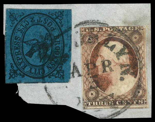 7251 Z 28L5 & 11 imageBrooklyn City Express Post, 1855-64, 2¢ black on dark blue with 3¢ Washington (Scott 28L5 & 11), Fine to Very Fine.