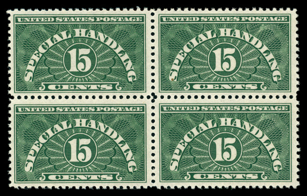 7241 nhbl QE2b imageSpecial Handling, 1955, 15¢ light green, dry printing (Scott QE2b), block of 4, o.g., never hinged, Very Fine to Extremely Fine.