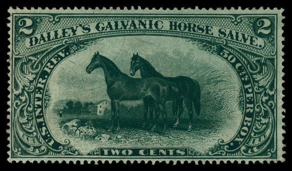 7274 O RS73b imageDalley's Galvanic Horse Salve, 2¢ green, silk paper (Scott RS73b), Fine to Very Fine.
