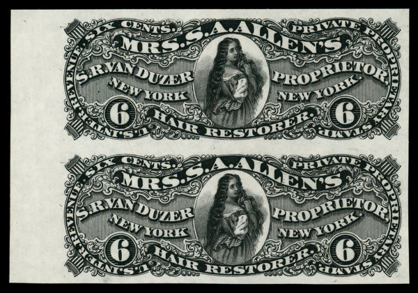 7276 P RS250P3 imageVan Duzer, S.R., 6¢ black, plate proof on India (Scott RS250P3), left margin vertical pair, without gum as issued, Very Fine to Extremely Fine.