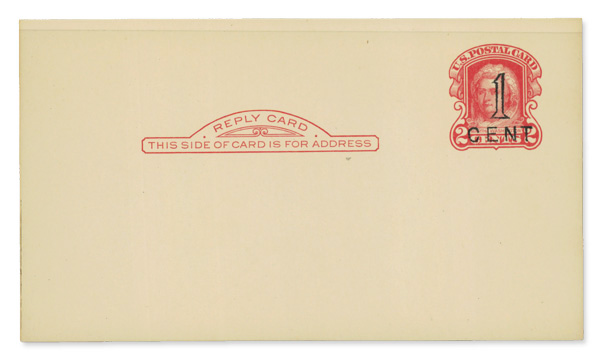 7263 ng UY10r imagePaid Reply Postal Card, 1920, 1¢ on 2¢ red on buff, typographed surcharge (Scott UY10r), reply card only, without gum as issued, Extremely Fine.