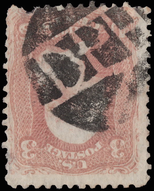 7339 O Unlisted imageMasonic Square & Compass (Skinner-Eno Unlisted), two accute angle; bold complete strike on a 3¢ rose (65). (Image) Suggested Bid $26