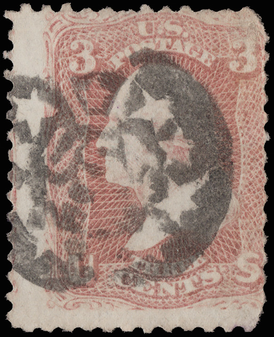 7337 O Unlisted imageNegative Star in Circle (Skinner-Eno Unlisted), gorgeous, "socked-on-the-nose" complete strike on a 3¢ rose (65). (Image) Suggested Bid $70