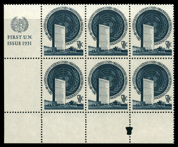 7325 nhbl 10 image1951, 50¢ indigo, 5th printing, with anvil cutout LL block (Scott 10), inscription block of 6, o.g., never hinged, Extremely Fine.