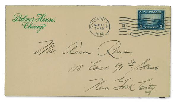 7331 cover hotels palmer house image[Hotels] Palmer House, Chicago, 5¢ (#399) tied to cover with Chicago machine cancel; light bends at top, Very Fine. (Image) Suggested Bid $19