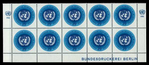 7326 nhbl 149 image1965, 25¢ U.N. Emblem, thin paper (Scott 149), bottom inscription block of 10 with imprint, o.g., never hinged, Superb.