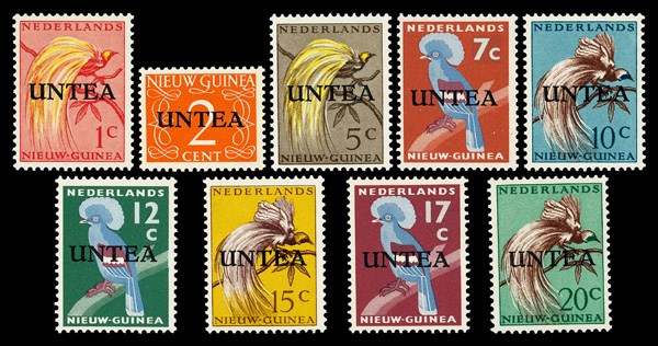 7329 nh 1a-19a image1962-63, 1c-5g Netherlands New Guinea, type 2 'UNTEA' overprint, complete (Scott 1a-19a), set of 19, o.g., never hinged, Very Fine to Extremely Fine.