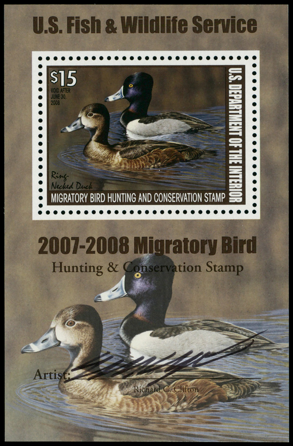 5369 nh RW74b imageHunting Permit, 2007, $15 Ring-necked Ducks, souvenir sheet (Scott RW74b), o.g., never hinged, Very Fine to Extremely Fine.