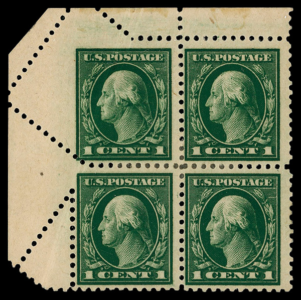 5375 ogbl 498 var. image1917, 1¢ green, unwatermarked, perf 11, pre-perforating fold-over (Scott 498 var.), corner margin block of 4, upper left corner block with fold-over that created "crazy perfs", o.g., hinged, Fine to Very Fine. (Image) Suggested Bid $80